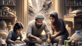 Amazonスマイルセールの賑わいを表現。人々がセール品に囲まれ、楽しそうに買い物をしている様子。