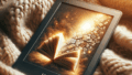 趣味ブログの例として、読書ブログをイメージ。開かれた本とKindle Paperwhiteが柔らかい毛布の上に置かれ、暖かい光が当たっている様子。